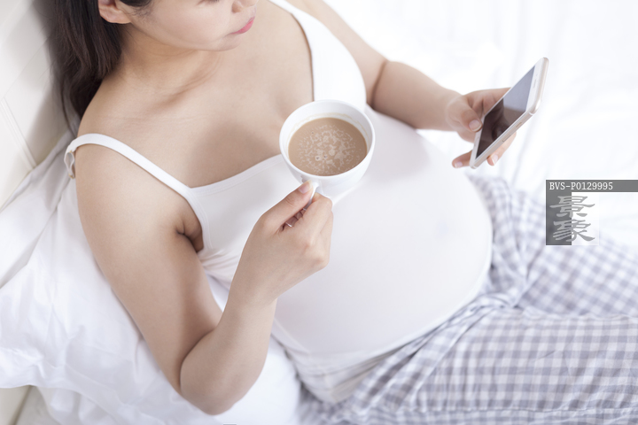 图片标题: 孕妇坐在床上一边使用手机一边喝着饮料