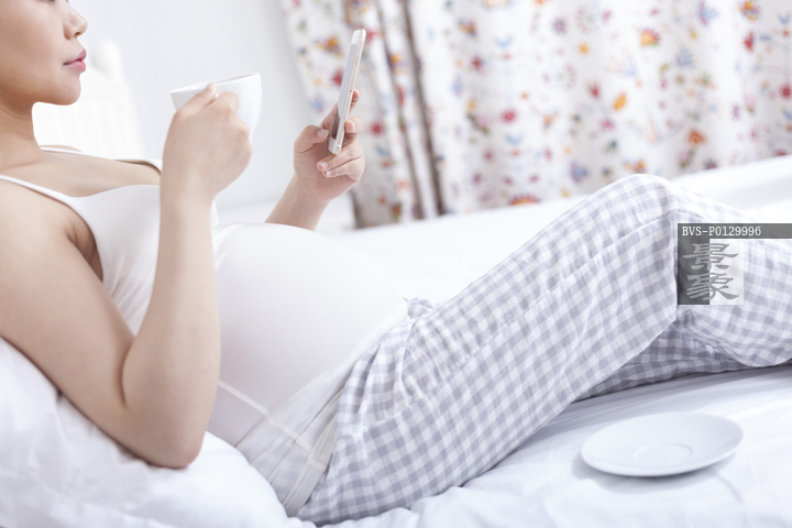 图片标题: 孕妇坐在床上一边使用手机一边喝着饮料