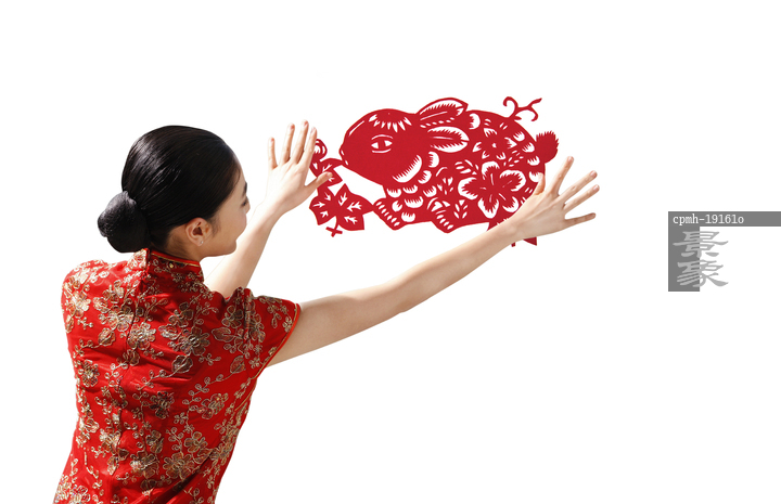 图片标题: 东方青年女人贴剪纸