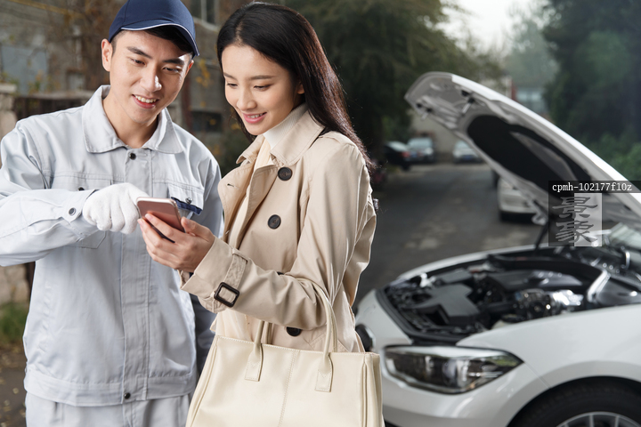 图片标题: 青年女人和汽车修理人员
