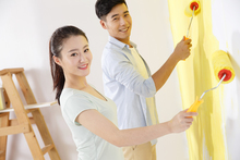 图片标题: 欢乐家庭在为墙壁涂染料