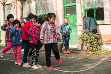 图片标题: 乡村女教师和学生户外活动