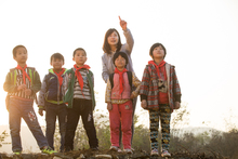 图片标题: 乡村女教师和学生在户外