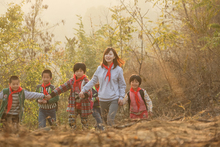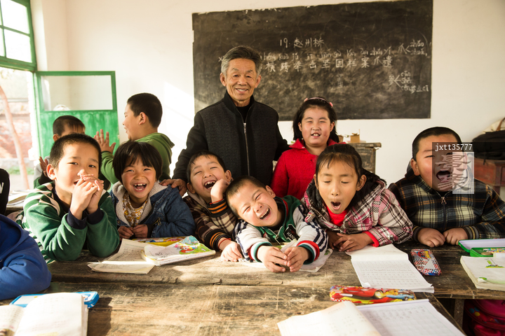 图片标题: 乡村男教师和小学生在教室里
