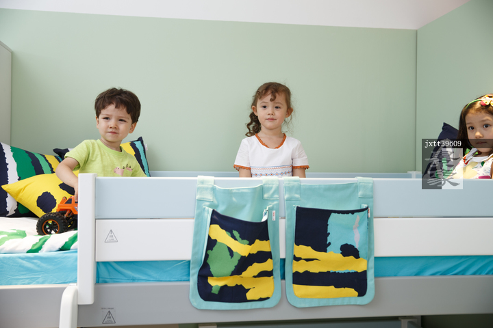 图片标题: 欢乐的儿童在床上玩耍