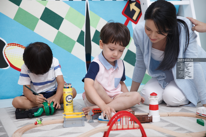 图片标题: 可爱的小男孩和指导教师在游戏室玩耍