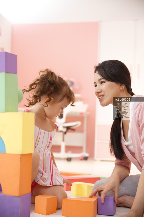 图片标题: 可爱的小女孩和妈妈在卧室玩耍