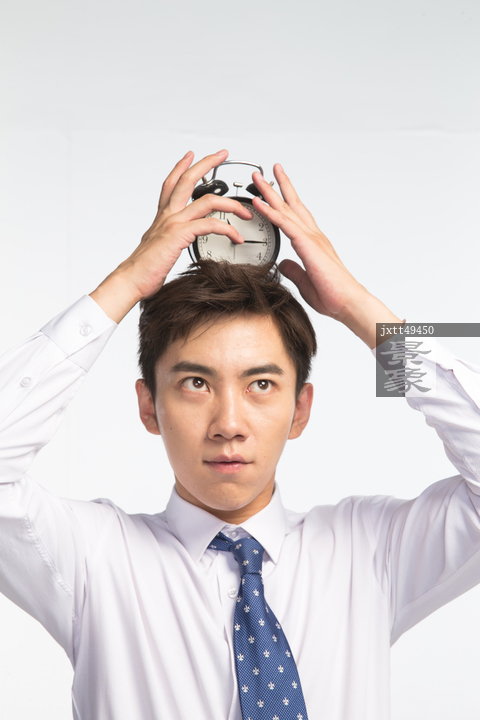 图片标题: 商务青年男人拿着闹钟