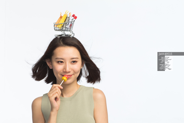 图片标题: 年轻女孩头顶购物车