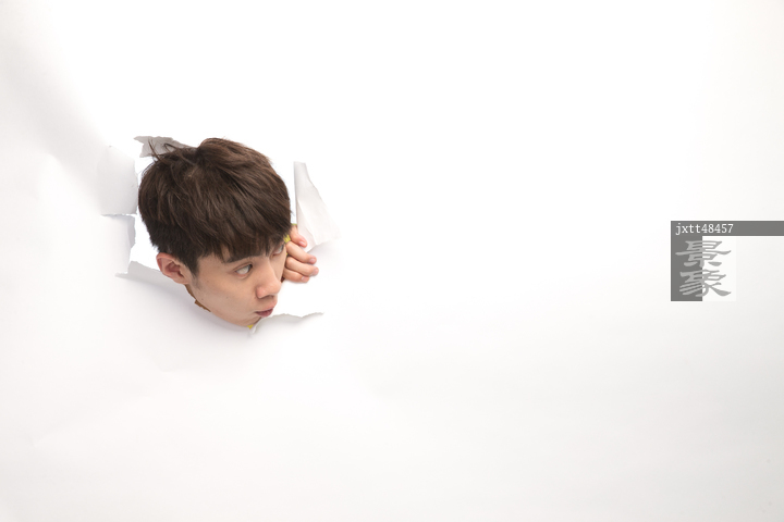 图片标题: 青年男人通过纸洞窥视
