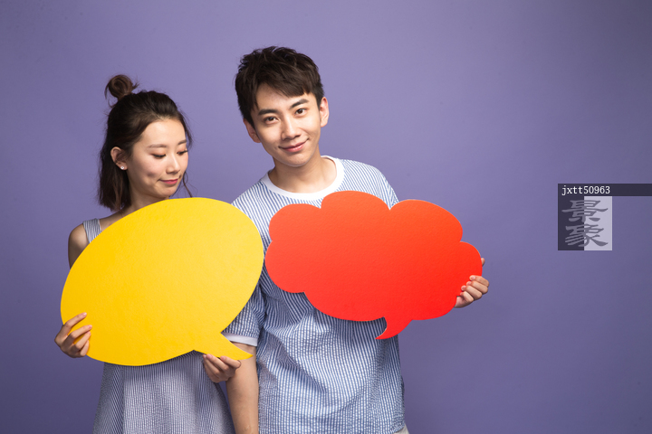 图片标题: 时尚青年男女拿着对话框