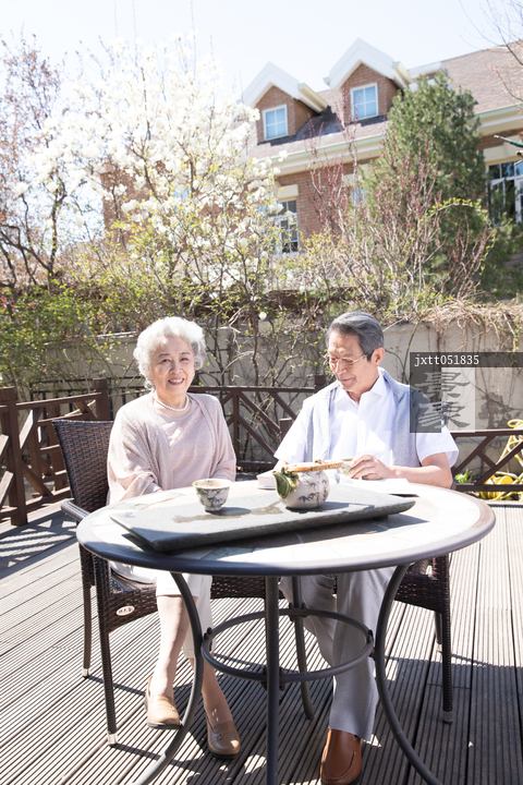 图片标题: 老年夫妇在庭院喝茶