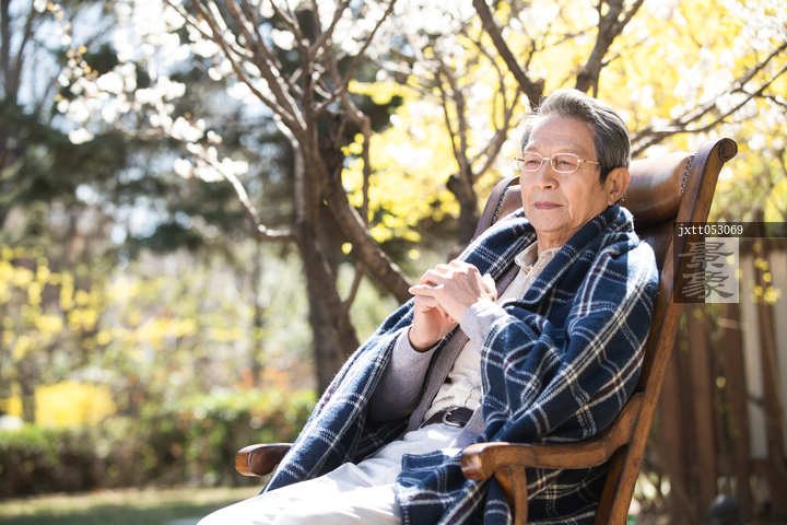 图片标题: 孤独的老年男人在院子里晒太阳