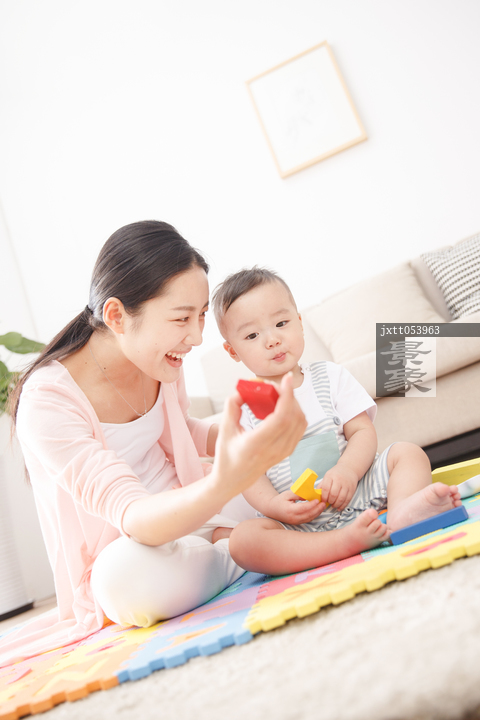 图片标题: 妈妈陪着宝宝客厅玩耍