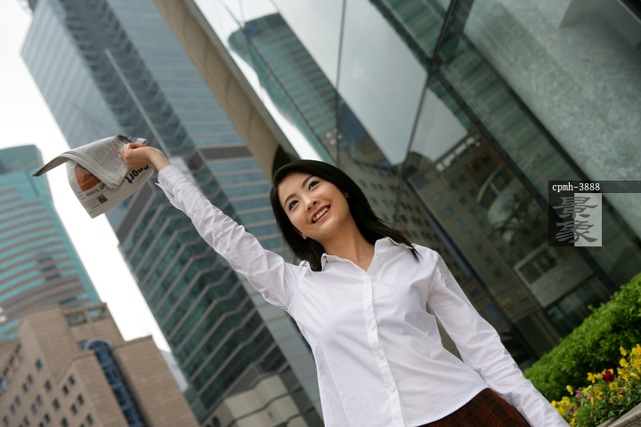 图片标题: 上海浦东写字楼旁一位女商务人士手举报纸