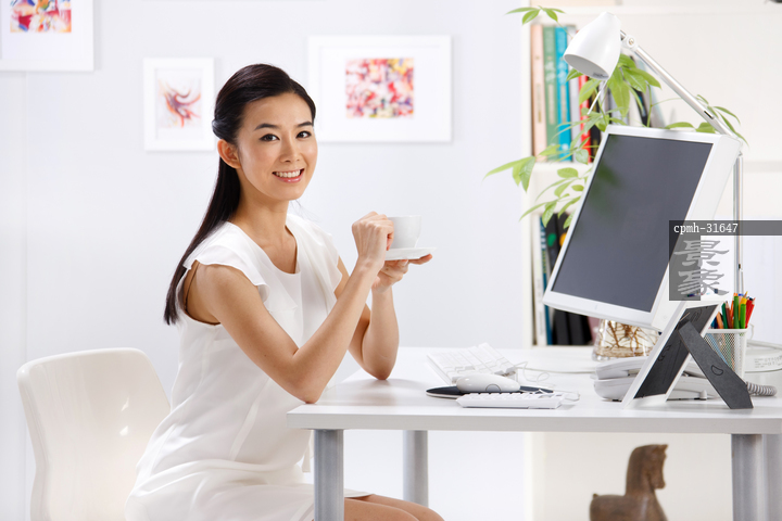 图片标题: 东方商务女人电脑前喝咖啡