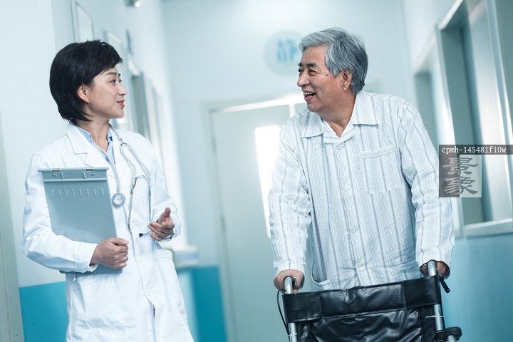 图片标题: 医生和老年男人在医院走廊