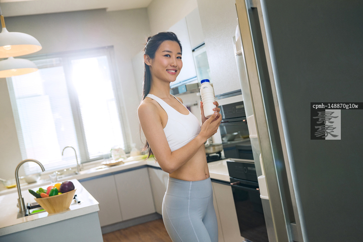 图片标题: 穿着运动装的青年女人在厨房