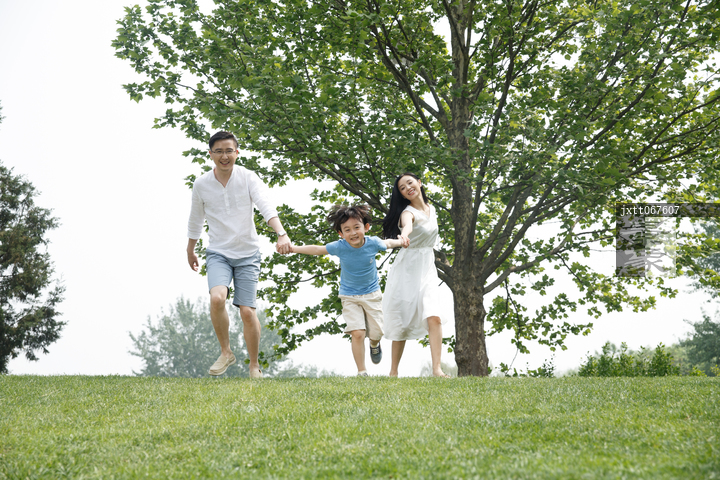 图片标题: 一家三口在草地上奔跑