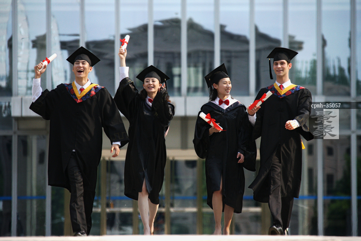 图片标题: 四个身穿学士服的大学生