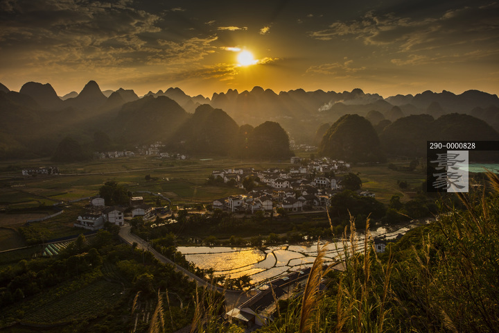 图片标题: 贵州省,兴义,万峰林,山峦叠翠,稻田,古民居