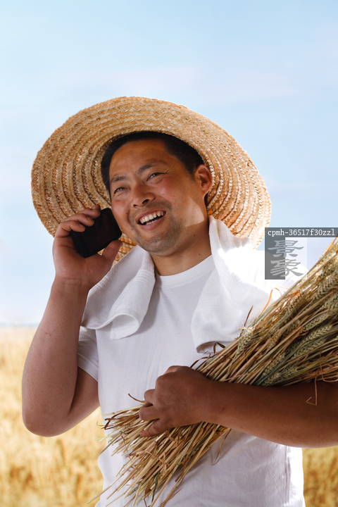 图片标题: 一个农民在麦田里打电话