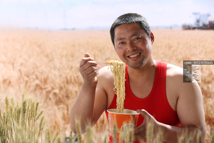 图片标题: 一个农民在麦田里吃方便面