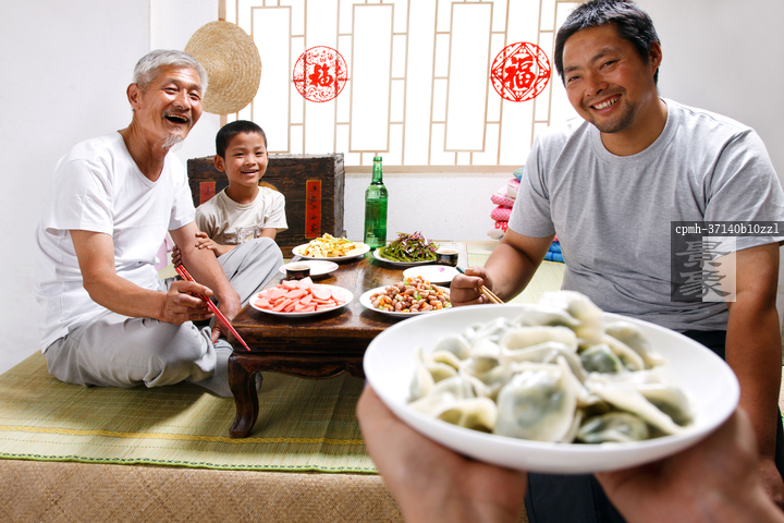 图片标题: 农民祖孙三代在吃饭