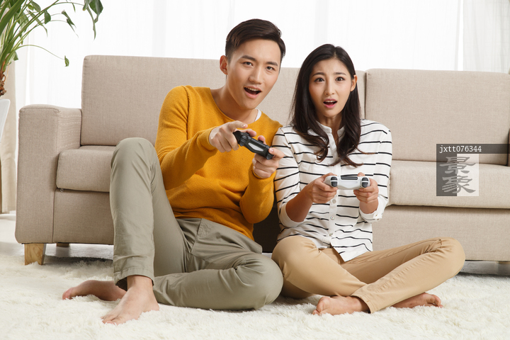 图片标题: 青年情侣坐着沙发上玩游戏