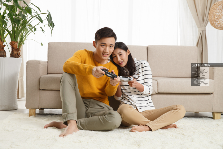 图片标题: 青年情侣坐着沙发上玩游戏