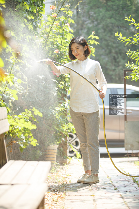 图片标题: 青年女人户外浇花