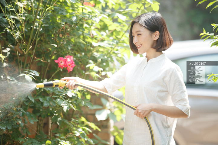 图片标题: 青年女人户外浇花