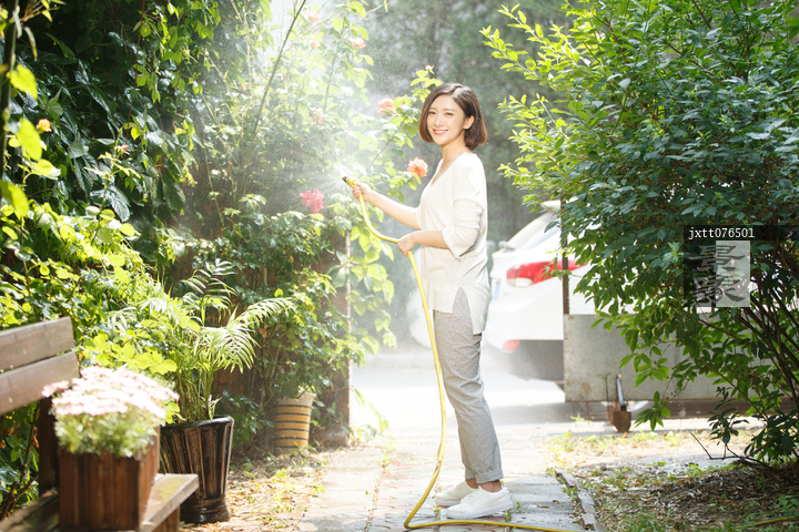 图片标题: 青年女人户外浇花