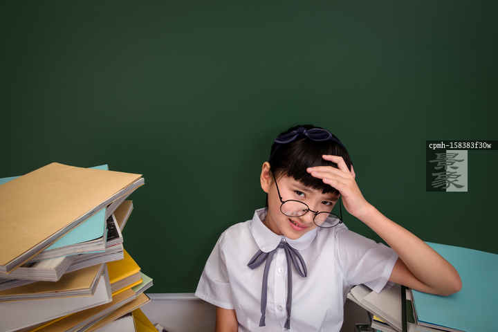 图片标题: 坐在书堆里的小学女生