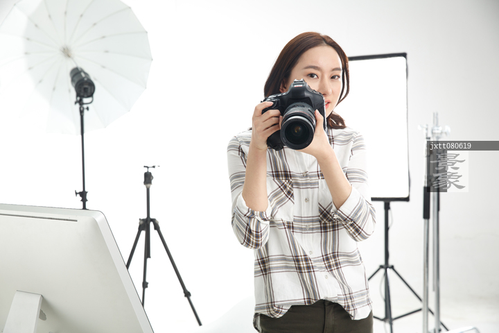 图片标题: 青年女摄影师拿着手机