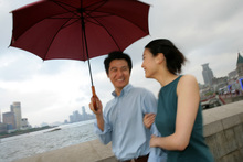 图片标题: 外滩黄浦江边一对情侣同撑一把伞行走