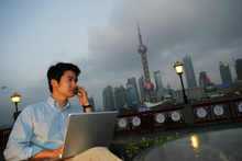 图片标题: 外滩黄浦江边一位男青年在桌旁使用笔记本电脑