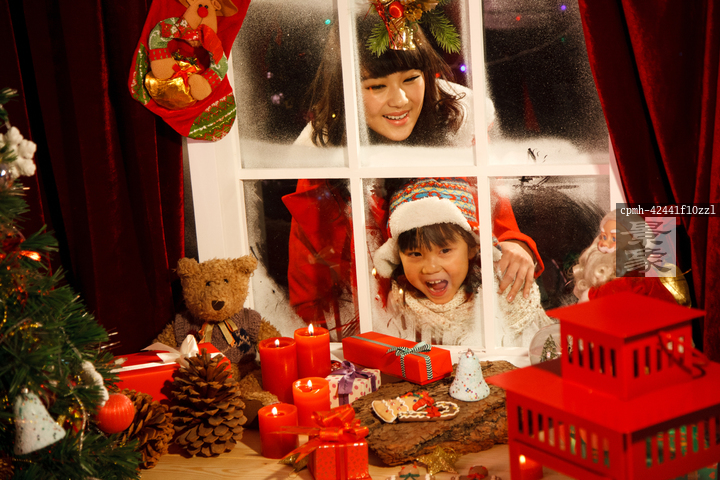 图片标题: 母女透过窗户看圣诞节礼物