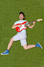 图片标题: 年轻男子躺在草地上弹吉他