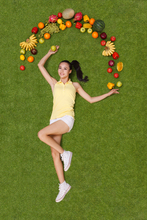 图片标题: 年轻男子躺在草地上手托着水果