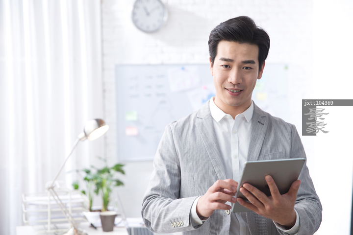 图片标题: 青年商务男人拿着平板电脑办公