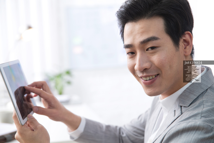 图片标题: 青年商务男人拿着平板电脑办公