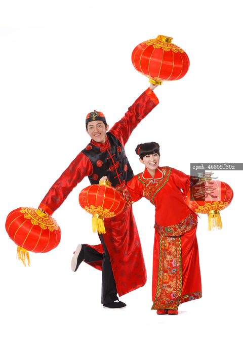 图片标题: 青年男女高举红灯笼恭贺新年