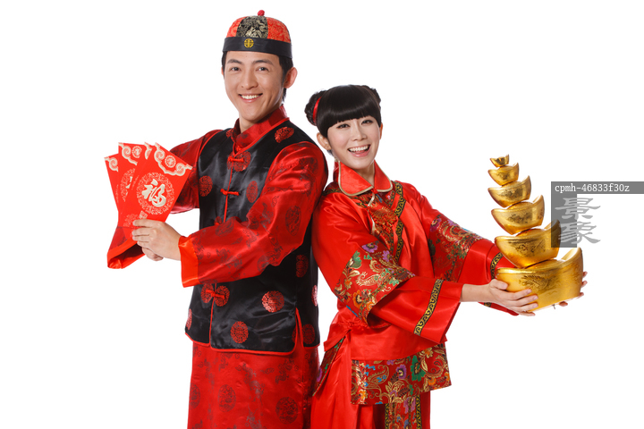 图片标题: 青年男女拿金元宝恭贺新年