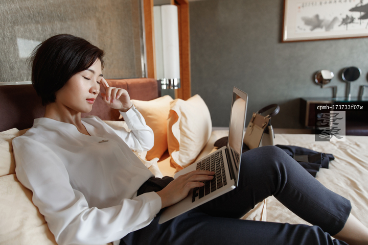 图片标题: 年轻女人趴在床上用电脑