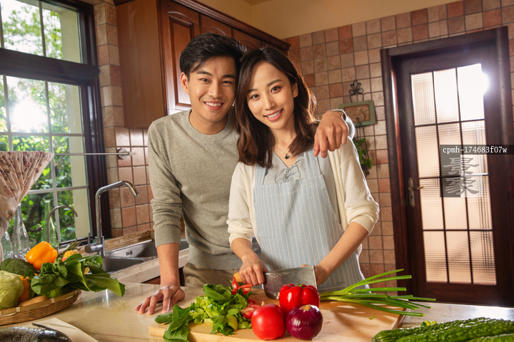 图片标题: 青年夫妇在厨房里做饭