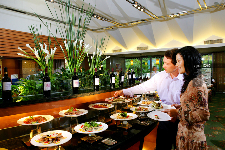 图片标题: 两位中外客人在酒店餐厅拿取自助餐
