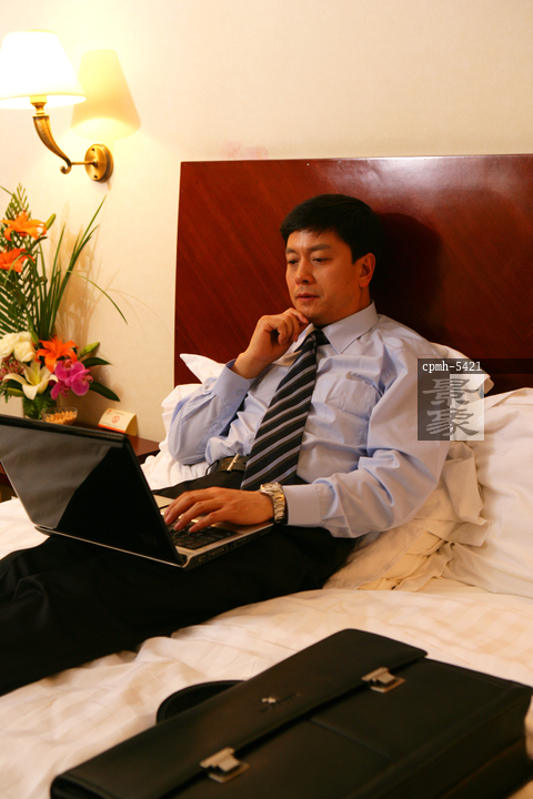 图片标题: 商务人士在酒店床上使用笔记本电脑