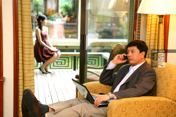 图片标题: 商务人士在酒店房间里边打电话边使用笔记本电脑