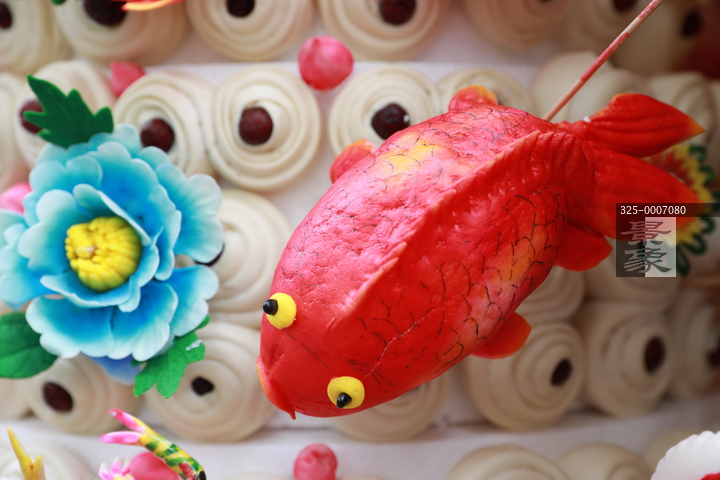 图片标题: 花馍造型:一条红鱼和玫瑰花。民间美食。